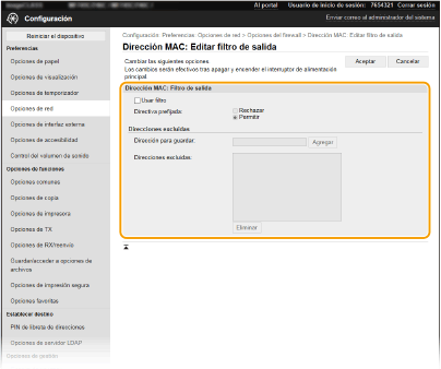 Para restringir los datos enviados desde el equipo a un ordenador, seleccione [Filtro de salida]. Para restringir los datos recibidos desde un ordenador, seleccione [Filtro de entrada].