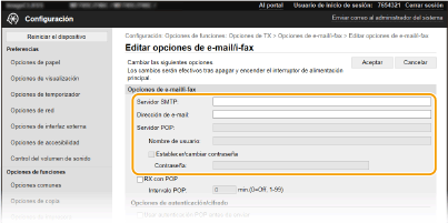 Utilice la IU remota para configurar las opciones detalladas de envío y recepción, como pueden ser las opciones para utilizar el equipo para enviar y recibir I-Faxes y las opciones para la autenticación POP y el cifrado de la comunicación antes de enviar e-mails o I-Faxes. Póngase en contacto con su proveedor o administrador de red para obtener la configuración necesaria.