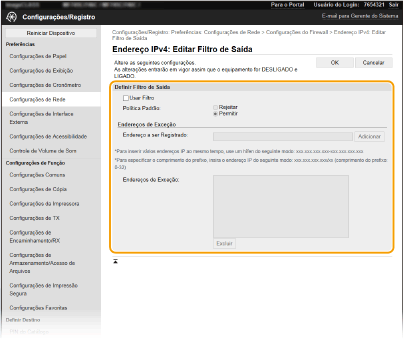 Selecione o filtro que corresponde ao endereço ao endereço IP. Para restringir os dados enviados da máquina para um computador, selecione [Filtro de Saída]. Para restringir os dados recebidos a partir de um computador, selecione [Filtro de Entrada].