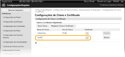 Uma chave e certificado não podem ser excluídos se estiver sendo usado atualmente para alguma finalidade, como quando "[TLS]" ou "[IEEE 802.1X]" está sendo exibido em [Uso da Chave]. Neste caso, desative a função ou substitua a chave e o certificado antes de excluí-los.