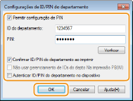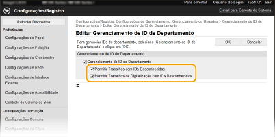 Definindo a Gerenciamento de IDs do departamento para a impressão do computador). Contudo, se a caixa de seleção for selecionada para essa configuração, os trabalhos são executados mesmo quando a ID e o PIN não são inseridos. Para configurar de modo que os trabalhos não sejam executados a menos que a ID e PIN de departamento corretos sejam inseridos, desmarque a caixa de seleção.
