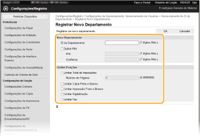 2 | Especifique as definições necessárias. [ID de Departamento] Insira o número de ID de departamento a ser registrada. [Definir PIN] Para definir um PIN, marque a caixa de seleção e digite um número de até sete dígitos nas caixas de texto [PIN] e [Confirmar]. [Limitar Funções] É possível restringir o número de páginas a imprimir e as funções para departamentos a serem registrados. Para restringir o número de páginas a imprimir, marque a caixa de seleção para o tipo desejado e digite o número apropriado de páginas [Número de Páginas]. Marque a caixa de seleção para as funções desejadas para restringir as funções. Se a caixa de seleção [Limitar Digitalização] estiver marcada, as funções Salvar no dispositivo de memória USB, Enviar e-mail e Salvar em pasta compartilhada ficarão restritas. Também é possível restringir outros métodos de digitalização de documentos importando esses documentos para um computador, mas nesse caso você não pode bloquear o acesso para cada ID de Departamento ( Bloqueando trabalhos quando a ID de departamento for desconhecida). |