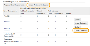 Se você deseja zerar os contadores, clique no link do texto correspondente e clique em [ID de Departamento] e clique em [Limpar Contagem]  [OK]. Se você deseja zerar os contadores de todas as IDs de departamento, clique em [Limpar Todas as Contagens]  [OK]. Usando placas de controleQuando o Copy Card Reader-F opcional está conectado à máquina, as IDs de departamento serão registradas automaticamente. Não exclua as IDs de departamento registradas. As placas de controle que correspondem às IDs de departamento excluídas ficarão indisponíveis. Você não pode usar [Limitar Funções] para restringir o número permitido de páginas a serem impressas. |