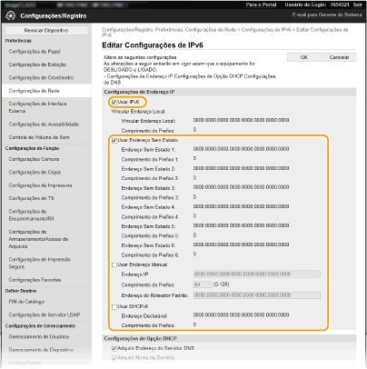 Vincular Endereço Local | Um endereço que é válido apenas em uma sub-rede ou link e não pode ser usado para comunicar com dispositivos além de um roteador. Um endereço local de link é definido automaticamente quando a função IPv6 da máquina for ativada. |