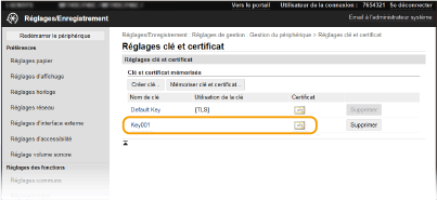Il est impossible de supprimer une clé avec certificat en cours d'utilisation pour une fonction, comme par exemple lorsque « [TLS] » ou « [IEEE 802.1X] » s'affiche sous [Utilisation de la clé]. Dans un tel cas, désactivez la fonction ou remplacez la clé avec certificat utilisée avant de la supprimer.