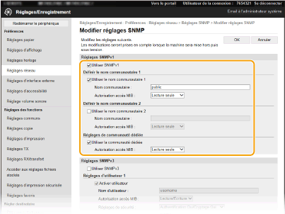 Si les deux versions du protocole SNMP sont activées en même temps, il est recommandé de définir les droits d'accès MIB pour SNMPv1 sur [Lecture seule]. Il est possible de définir différemment les droit d'accès MIB pour les protocoles SNMPv1 et SNMPv3 (ainsi que pour chaque utilisateur dans SNMPv3). Sélectionner [Lecture/Écriture] (tous les droits d'accès) dans SNMPv1 annule les puissantes fonctions de sécurité qui caractérisent SNMPv3, car la plupart des réglages de l'appareil sont alors contrôlés par SNMPv1.