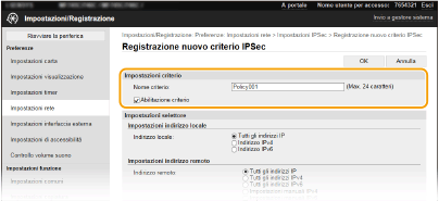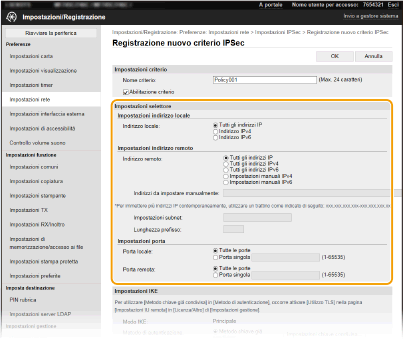 Se viene selezionato [Impostazioni manuali IPv4] o [Impostazioni manuali IPv6] per [Indirizzo remoto], immettere l'indirizzo IP per applicare il criterio. È anche possibile immettere un intervallo di indirizzi inserendo un trattino tra gli indirizzi.