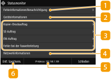 Wenn Sie <Statusmonitor> drücken, wird ein Bildschirm angezeigt, auf dem Sie den Fortschritt von Dokumenten sowie den Status des Geräts und die Netzwerkeinstellungen überprüfen können.