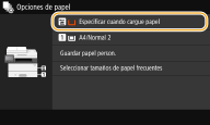 Una vez registradas las opciones de papel predeterminadas, la pantalla de configuración del papel no aparece cuando se carga papel, y se utiliza la misma configuración en todo momento. Si carga un tamaño o tipo de papel diferentes sin cambiar las opciones de papel, es posible que el equipo no imprima correctamente. Para evitar este problema, seleccione <Especificar cuando cargue papel> en el paso 3, y, a continuación, cargue el papel. |
