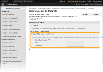 ![]() Uso del panel de controlTambién es posible ver las opciones de PIN para acceder a la IU remota desde <Menú> en la pantalla Inicio. <Opciones de IU remota> Si se inicializan las <Opciones de gestión>El PIN de acceso a IU remota también se inicializará. Tras una inicialización, vuelva a establecer el PIN. <Inicializar menú> |