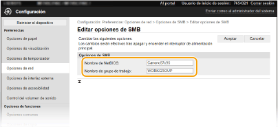 El nombre del grupo de trabajo es un nombre para agrupar varios ordenadores de forma que las funciones de red básicas, como el uso compartido de archivos, estén disponibles en una red Windows. Especifique el nombre del grupo de trabajo para identificar el grupo al que pertenece el equipo.