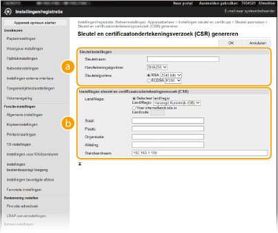 Op het apparaat gegenereerde certificaten hebben geen CA-handtekening, een communicatiefout kan het gevolg zijn, afhankelijk van de apparaten waarmee het communiceert. Voordat de certificeringsinstantie het certificaat met CA-handtekening kan afgeven, moet u CSR-gegevens (Certificate Signing Request) verkrijgen die de beheerder van de UI op afstand kan genereren. Als het certificaat is verstrekt, registreer het dan in de sleutel met de gegenereerde CSR.