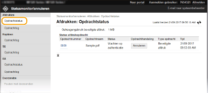 Ongeacht de instelling van Afdeling-ID beheer, bevat de lijst alle afdruktaken die worden afgedrukt en die wachten op afdrukken. Als u een gebruikersnaam hebt ingevoerd tijdens het inloggen in de Algemene Gebruikersstand, wordt uw gebruikersnaam alleen weergegeven op de documenten die u hebt afgedrukt. Klik op [Opdrachtnummer] op de gepauzeerde documenten en de beveiligde documenten om gedetailleerde informatie weer te geven. U kunt de gebruikersnaam en de paginatelling van het afgedrukte document controleren. |