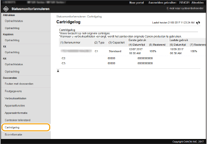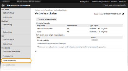 Het papierformaat en de papiersoort voor de papierbron, het modelnummer van de tonercartridge, enz. worden weergeven. U kunt deze pagina ook weergeven door op [Details verbruiksartikelen controleren] in de portalpagina (hoofdpagina) te klikken (