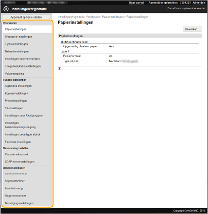 U kunt verschillende instellingen van het apparaat wijzigen met de UI op afstand. De meeste instellingen kunnen ook via het bedieningspaneel van het apparaat worden gewijzigd, maar sommige instellingen kunt u alleen wijzigen via de UI op afstand. Dit gedeelte beschrijft de basisprocedure voor het veranderen van de instelling van het apparaat met behulp van de UI op afstand.