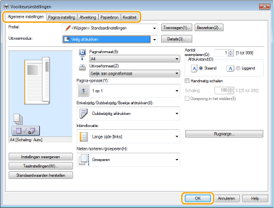 Selecteer het printerstuurprogramma voor dit apparaat en klik op [Voorkeursinstellingen] of [Eigenschappen].