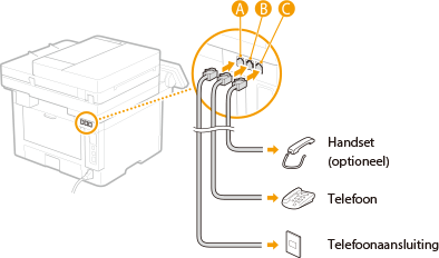 Als u een optionele handset gebruikt, moet u de aansluiting voor de handset () van het apparaat gebruiken.