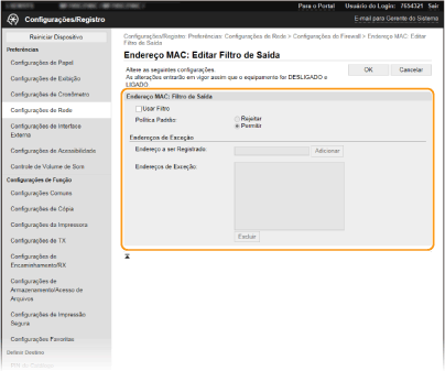 Se os endereços MAC não forem introduzidos corretamente, pode não conseguir aceder à máquina a partir da UI Remota; nesse caso, será necessário definir <Filtro de Endereço MAC> para <Desativ.>. <Filtro de Endereço MAC>