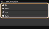 <Ρυθμίσεις λειτουργίας> <Αποστολή> <Ρυθμίσεις φαξ>. Ωστόσο, οι ρυθμίσεις που κάνετε στο <Βιβλ δ/νσεων> εφαρμόζονται στις λεπτομερείς ρυθμίσεις των προορισμών που έχετε καταχωρήσει στο Βιβλίο διευθύνσεων. |