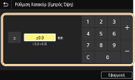 Κατά τη ρύθμιση της θέσης εκτύπωσης, καθορίστε την κατεύθυνση με «+» και «-» και την απόσταση με «mm». Για την επιλογή <Ρύθμ Κατακόρ (Εμπρός Όψη)>/<Ρύθμ Κατακόρυφα (Πίσω Όψη)>, καθορίστε μια τιμή με πρόσημο «+» για μετατόπιση της θέσης εκτύπωσης στην κατεύθυνση από επάνω προς τα κάτω. Για την επιλογή <Ρύθμιση Οριζ. (Εμπρός Όψη)>/<Ρύθμιση Οριζόντια (Πίσω Όψη)>, καθορίστε μια τιμή με πρόσημο «+» για μετατόπιση της θέσης εκτύπωσης στην κατεύθυνση αριστερά προς δεξιά. Για μετατόπιση στην αντίθεση κατεύθυνση, καθορίστε μια τιμή με πρόσημο «-».