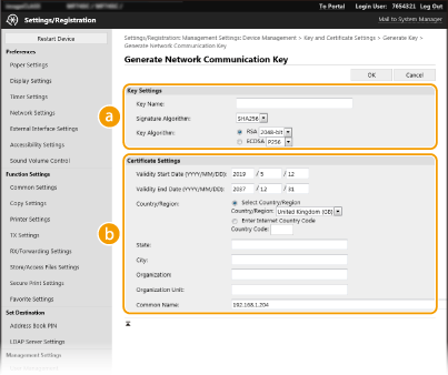 Μπορείτε να δημιουργήσετε κλειδί και πιστοποιητικό από τη συσκευή, όταν είναι απαραίτητο για την κρυπτογραφημένη επικοινωνία μέσω TLS (ασφάλεια επιπέδου μεταφοράς). Μπορείτε να χρησιμοποιήσετε το TLS όταν έχετε πρόσβαση στη συσκευή μέσω του Remote UI (Απομακρυσμένο περιβάλλον εργασίας). Τα αυτόματα υπογεγραμμένα πιστοποιητικά χρησιμοποιούνται με το κλειδί και το πιστοποιητικό που δημιουργούνται με την επιλογή «Network Communication».
