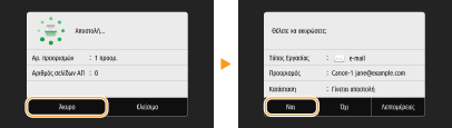 Εάν θέλετε να ακυρώσετε την αποστολή εγγράφων αμέσως αφού πατήσετε <Έναρξη>, επιλέξτε <Άκυρο> στην οθόνη ή πατήστε . Μπορείτε επίσης να ακυρώσετε την αποστολή εγγράφων μετά τον έλεγχο της κατάστασης αποστολής.