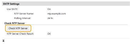 [Network Settings] [Check NTP Server] στο [SNTP Settings]. Εάν έχει δημιουργηθεί ορθή σύνδεση, το αποτέλεσμα εμφανίζεται όπως απεικονίζεται παρακάτω. Σημειώστε ότι αυτή η λειτουργία δεν ρυθμίζει το ρολόι συστήματος.
