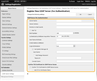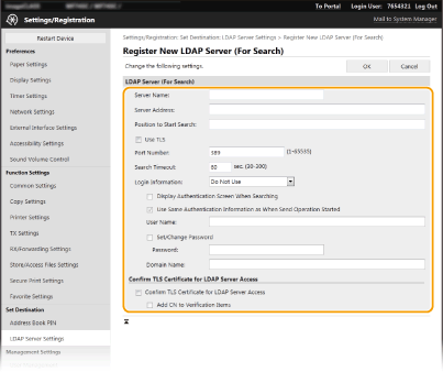 Η καταχώριση ενός διακομιστή LDAP πρέπει να πραγματοποιηθεί ξεχωριστά, ανάλογα με το αν πρόκειται να χρησιμοποιηθεί για αναζήτηση ή πιστοποίηση. Για να χρησιμοποιήσετε ένα διακομιστή LDAP για αναζήτηση προορισμών φαξ και e-mail, πρέπει να ακολουθήσετε τη διαδικασία καταχώρισης για αναζήτηση και για να τον χρησιμοποιήσετε για πιστοποίηση κατά την αποστολή e-mail ή φαξ, πρέπει να ακολουθήσετε τη διαδικασία καταχώρισης για πιστοποίηση.
