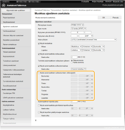 Valitse asetuksen [Aseta automaattisen sulkeutumisen viikkoajastin] valintaruutu ja määritä virran katkaisuaika.