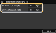Valitse <Kyllä>, jos haluat tulostaa lähetyksen ja vastaanoton raportit erikseen, tai <Ei>, jos haluat tulostaa molemmat raportit samalle arkille.
