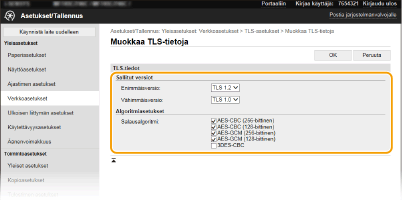 Voit salata tiedonsiirron laitteen ja tietokoneen selaimen välillä käyttämällä TLS:ää (Transport Layer Security). TLS on mekanismi, jolla verkossa lähetetty tai vastaanotettu data salataan. TLS:n täytyy olla käytössä, kun etäkäyttöliittymää käytetään seuraavien asetusten määrittämiseen: IPSec (Esijaettu avain -menetelmä), IEEE 802.1X-todennus (TTLS/PEAP) tai SNMPv3. Jotta voit käyttää TLS-salattua tiedonsiirtoa etäkäyttöliittymässä, sinun on määritettävä avain ja varmenne (palvelinvarmenne) ja otettava TLS käyttöön. Luo tai asenna TLS:n avain ja varmenne ennen TLS:n käyttöön ottamista (