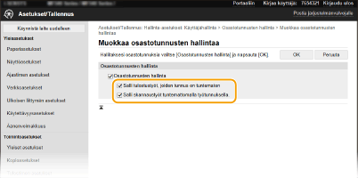 Osastotunnuksen ottaminen käyttöön töiden suorittamiseen tietokoneesta). Jos tämän asetuksen valintaruutu on kuitenkin valittu, työt suoritetaan, vaikka tunnusta ja PIN-koodia ei syötettäsi. Jos haluat määrittää asetuksen niin, että mitään työtä ei suoriteta, ellei oikeaa osastotunnusta ja PIN-koodia ole syötetty, tyhjennä valintaruutu.