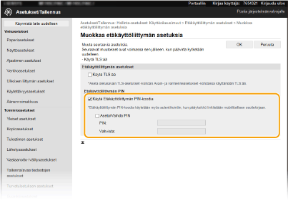 ![]() Kun osastotunnusten hallinta on käytössä, asetusta tässä ei tarvita. Osastotunnusten hallinnan asettaminen Lisätietoja suoritettavista perustoimenpiteistä, kun laitteen asetukset tehdään etäkäyttöliittymästä on kohdassa Valikkovaihtoehtojen asettaminen Etäkäyttöliittymästä. |