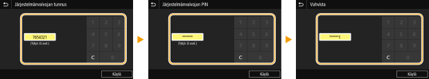 Asetusten määrittäminen etäkäyttöliittymälläKäynnistä etäkäyttöliittymä ja kirjaudu sisään järjestelmänvalvojan tilassa. Napsauta [Asetukset/Tallennus] [Käyttäjähallinta] [Järjestelmänvalvojan tiedot] [Muokkaa] ja määritä tarvittavat asetukset avautuvassa näytössä.Etäkäyttöliittymää käyttämällä voit tallentaa erilaisia tietoja, mm. yhteystietoja, pääkäyttäjän kommentteja, laitteen asennuspaikan sekä asetuksia, jotka voit tallentaa käyttöpaneelin avulla. Tallennettuja tietoja voidaan tarkastella etäkäyttöliittymän [Laitetiedot]-sivulla. Järjestelmänvalvojan tietojen tarkistaminen Kirjautuminen laitteeseenJos yrität käyttää kohteita, jotka vaativat pääkäyttäjän oikeuksia, esimerkiksi <Verkko> ja <Hallinta-asetukset>, kun järjestelmän pääkäyttäjän tunnus on määritetty, kirjautumisnäyttö tulee esiin. Kirjautuminen laitteeseen Sinun täytyy myös syöttää järjestelmänvalvojan tunnus ja PIN-koodi, jotta voit kirjautua käyttämään etäkäyttöliittymää järjestelmänvalvojan tilassa. Etäkäyttöliittymän käynnistäminen |