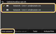 2 | Valitse poistettavan vastaanottajan valintaruutu ja valitse <Poista vastaanott.>. ![]() ![]() Jos valitset Ryhmä-valintaruudun, voit tarkastella ryhmään tallennettuja vastaanottajia valitsemalla <Tiedot> <Vastaanottaja>. |