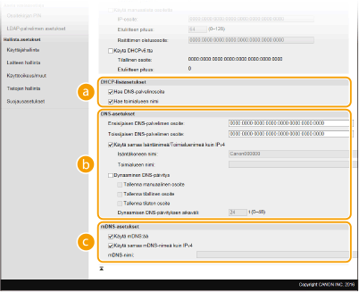 DNS (Domain Name System) tarjoaa palvelun, jolla isäntäkoneen (tai toimialueen) nimi yhdistetään IP-osoitteeseen. Määritä DNS-, mDNS- tai DHCP-asetukset tarpeen mukaan. Huomaa, että DNS-asetusten määritys on erilainen IPv4:ssä ja IPv6:ssa.