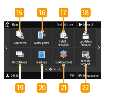 ![]() | <Pappersinst.>Den här knappen används för att ange format och typ för papperet som är påfyllt i papperslådan eller universalfacket. Ange pappersformat och -typ <Mobil portal>Använd denna knapp för att upprätta en anslutning till en mobil enhet. Ansluta med mobila enheter <Inställn. hemskärm>Här kan du ändra i vilken ordning som Hem-skärmknapparna visas. Anpassa skärmen Hem <Uppdatera firmware>Det går att uppdatera firmware via Internet. Uppdatera firmware <ID-kortskopia>Använd den här funktionen för att kopiera fram- och baksidan av körkort och andra ID-handlingar på en och samma papperssida. Kopiera ID-kort <Passkopia>Du kan kopiera flera pass på samma sida. Göra passkopior <Funktionsguide>Tryck för att visa bruksanvisning och felorsaker/lösningar. |
