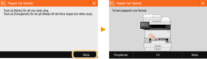 I vissa fall visas anvisningar om hur du ska åtgärda felet. Följ anvisningarna på skärmen för att lösa problemet. Skärmen som visas när ett pappersstopp inträffar visas nedan som ett exempel.