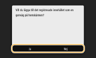 Om du väljer <Ja> visas ett meddelande. Kontrollera meddelandet och välj sedan <OK>. Den registrerade inställningskombinationen läggs till som en snabbvalsknapp på skärmen Hem.