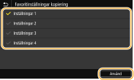 Markera kryssrutan för alla inställningar som ska visas på skärmen Hem och välj <Använd>.