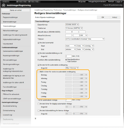 Du kan ställa in enheten så att den automatiskt stängs av vid ett visst klockslag olika veckodagar. På så vis undviker du onödig strömförbrukning på grund av att strömmen inte är avstängd under perioder då enheten inte ska användas. Den här funktionen är inaktiverad i standardinställningarna.