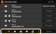 ![]() | Du kan registrera ofta använda fax-/skanningsmottagare i adressboken så att de lätt kan väljas när det behövs (Registrera mottagare i adressboken). Du kan söka efter mottagare alfabetiskt, i listor i adressboken eller genom att ange tresiffriga nummer (kortnummer). Du kan också ange mottagare snabbare genom att göra så här. |