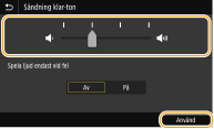 <Inmatningston> | Bekräftelseljud varje gång en knapp på kontrollpanelen eller på skärmen trycks ned | Välj <På> (avger en ton) eller <Av> (avger ingen ton) och fortsätt sedan med steg 5. |