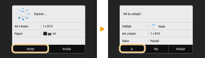 Om du vill avbryta kopieringen omedelbart efter att ha valt <Start> väljer du <Avbryt> på skärmen eller också trycker du på