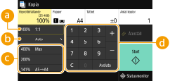 <Orig./efterbeh.>![]() | Du kan förstora eller förminska kopior genom att använda ett förinställt reproförhållande, till exempel <A5->A4>, eller genom att ställa in en anpassat reproförhållande i steg om 1 %. |