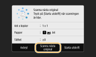 1 | Placera nästa original på originalglaset och välj <Scanna nästa original>. Du kan även ange <Täthet> och <Originaltyp> var för sig för respektive original. ![]() Upprepa det här steget tills hela originalet har skannats. |