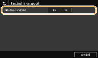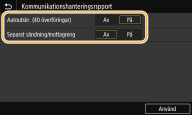 Välj <På> när du vill skriva ut rapporten automatiskt efter var 40:e överföring och <Av> om ingen automatisk utskrift ska göras.