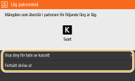 Meddelandet informerar dig om att tonerpatronen snart behöver bytas ut. Se till att ha en ny tonerpatron till hands. Byt tonerpatron om du ser det här meddelandet innan du ska börja skriva ut ett stort jobb. Det visas när <Åtgärd vid varning> är inställt på <Avbryt utskrift> (
