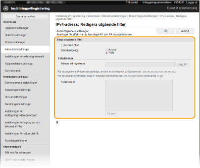 1 | Markera kryssrutan [Använd filter] och klicka på [Avvisa] eller [Tillåt] för att välja [Standardpolicy]. [Använd filter] Markera kryssrutan om du vill begränsa kommunikationen. Avmarkera kryssrutan för att inaktivera begränsningen. [Standardpolicy] Välj förhandsvillkor för att tillåta eller avvisa andra enheters kommunikation med enheten. [Avvisa] | Välj det här alternativet om du bara vill godkänna kommunikationspaket när de skickas till eller kommer från enheter vars IP-adresser angetts i [Feladresser]. Kommunikation med andra enheter förbjuds. | [Tillåt] | Välj det här alternativet om du vill blockera kommunikationspaket när de skickas till eller kommer från enheter vars IP-adresser angetts i [Feladresser]. Kommunikation med andra enheter tillåts. |