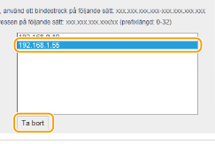 När [Avvisa] väljs för utgående filter Utgående multicast- och sändningspaket kan inte filtreras. Ta bort en IP-adress från undantag Välj IP-adress och klicka på [Ta bort]. |